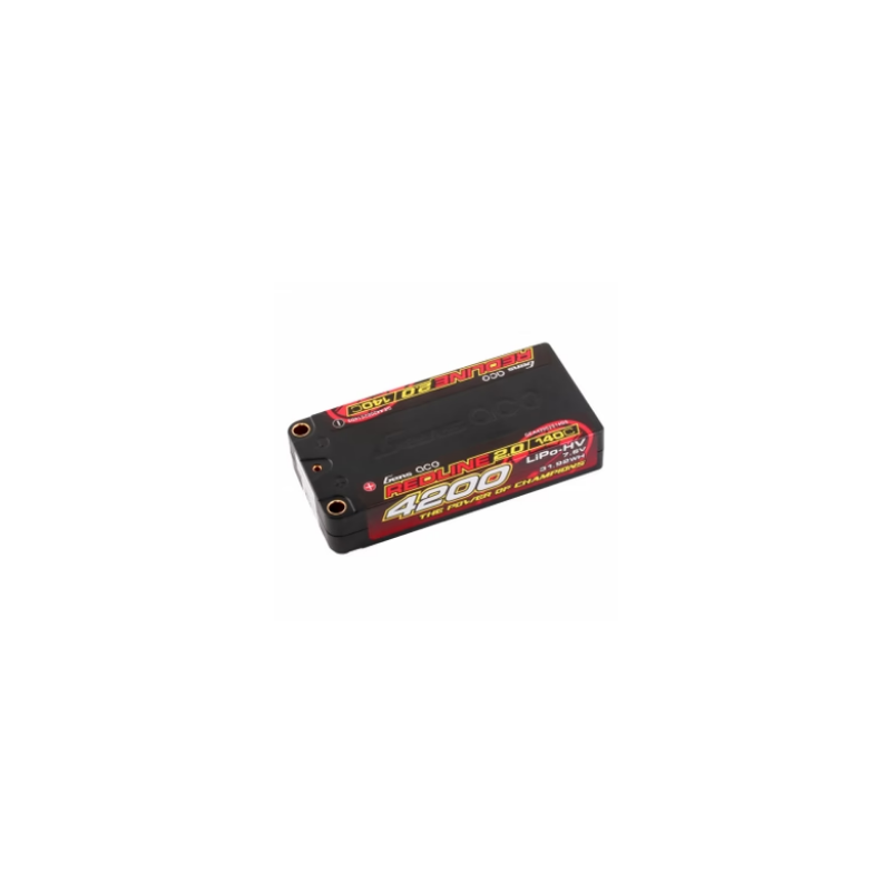 Gens Ace Redline 2.0 Series 2S 140C 4200mAh Hardcase LiPo Battery Pack, with a factory installed 5.0mm bullet. Consumers trust the Gens Ace name to deliver the dependability and high performance they expect. The Gens Ace 140C 2S 4200mAh 7.6V HV LiPo battery pack has a high-capacity, high-discharge rate that gives you the power and run-time you expect .