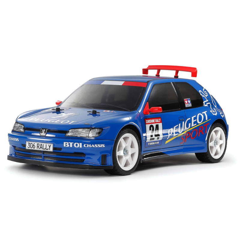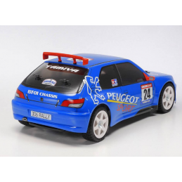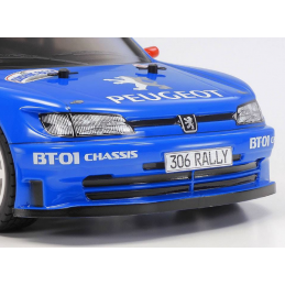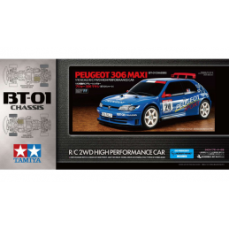 Ce kit RC associe le châssis BT-01 à deux roues motrices, cette fois avec empattement standard, moteur avant / traction avant (FF) à la carrosserie reproduisant fidèlement la Peugeot 306 Maxi.
