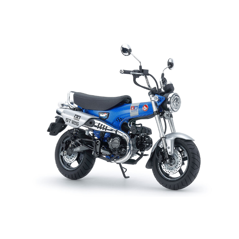 La Honda Dax trouve ses origines en 1969, et en mars 2022, elle a été modernisée avec la Dax 125, un modèle qui conserve l'esprit du modèle original, notamment grâce à son cadre en T. Son moteur de 123 cm³ est associé à une boîte de vitesses à 4 rapports, dont le passage se fait sans embrayage, ce qui en fait une excellente moto de tourisme. La version Tamiya Limited Edition, commercialisée exclusivement en Thaïlande, arbore un somptueux cadre bleu métallisé orné de nombreuses pièces en édition limitée.