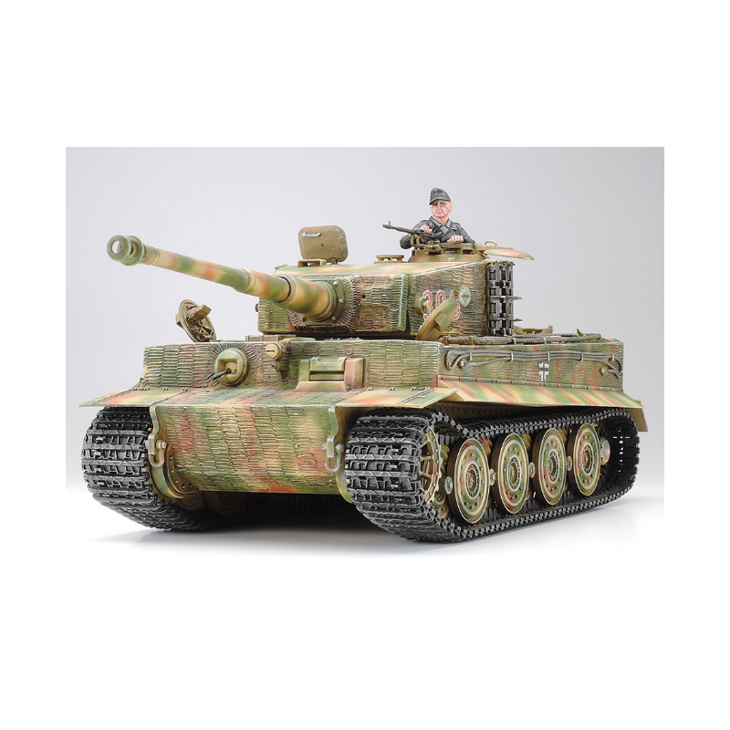Durant la Seconde Guerre mondiale, le char allemand Tiger I était redouté des Alliés pour son blindage épais et son puissant canon de 88 mm. Ce kit de maquette en plastique à l'échelle 1/35 représente la version de fin de production du Tiger I, mise en production à partir de janvier 1944 et apparue sur le front de Normandie. Les caractéristiques de cette version, telles que sa silhouette distinctive, son puissant canon de 88 mm, le périscope sur la coupole du chef de char et ses roues en acier embouti, sont fidèlement reproduites. De plus, la zone de chargement des obus dans la tourelle ainsi que le dessous des trappes bénéficient d'une finition détaillée. Le kit comprend deux types de canons et de mantelets permettant de construire la version finale. Une figurine de chef de char est également incluse.