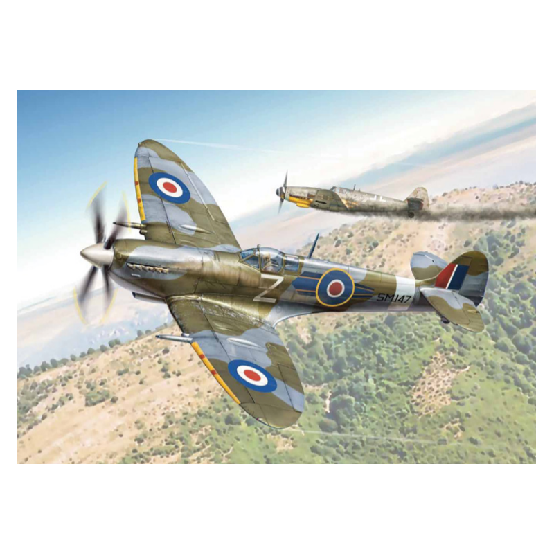 Le chasseur Supermarine Spitfire peut sans conteste être considéré comme l'un des avions les plus célèbres de l'histoire de l'aviation et une icône de la production aéronautique britannique. Monomoteur à aile basse doté d'un armement offensif performant, ses premières versions, aux côtés du Hawker Hurricane, constituèrent l'épine dorsale des escadrilles de chasse de la Royal Air Force durant la bataille d'Angleterre contre la Luftwaffe allemande. La victoire lors de cette bataille contribua à asseoir le prestige du Spitfire. Il se caractérisait par une conception harmonieuse, une aile elliptique et un puissant moteur Rolls-Royce Merlin. Tout au long de la guerre, afin de contrer les innovations technologiques de ses adversaires, qui menèrent au développement du redoutable Focke-Wulf Fw 190, le Spitfire connut une évolution constante de sa configuration aérodynamique et de ses moteurs. Le Spitfire Mk IX entra ensuite en production et, grâce à ses performances, put rivaliser à armes égales avec les chasseurs allemands les plus modernes.