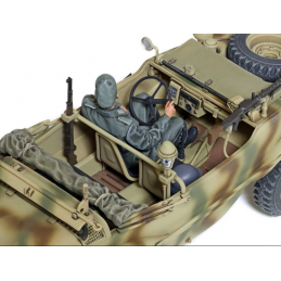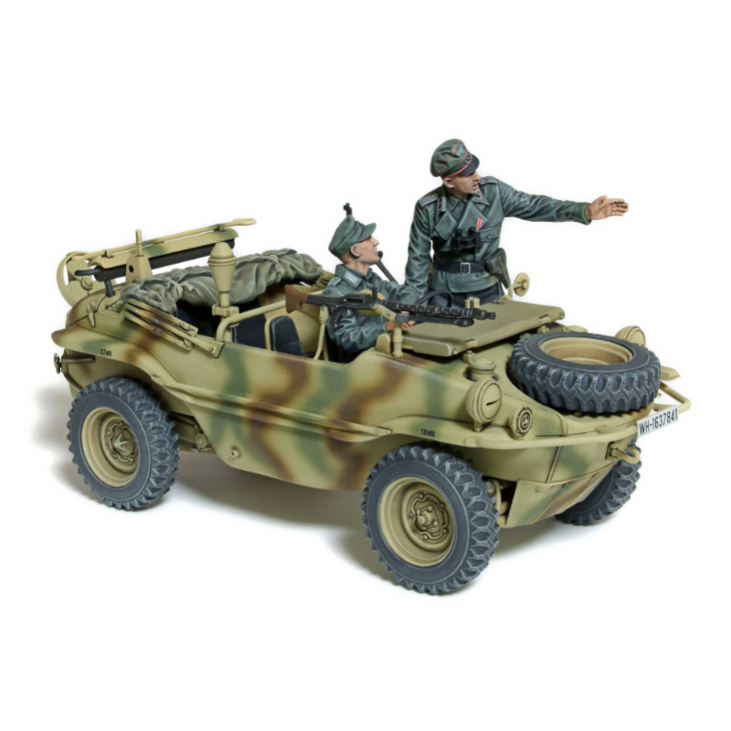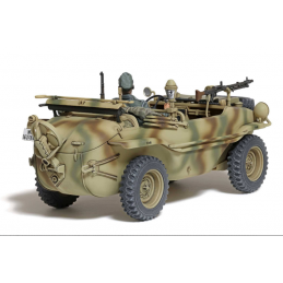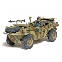 La Schwimmwagen au 1/35 de Tamiya (35224) est une référence pour les maquettistes militaires depuis 1998. Ce kit toujours disponible reproduit la version à pneus étroits de 133mm. Cette variation sous la réf.35393 reproduit celle équipée de pneus larges de 200mm avec en plus divers armements et de nouvelles figurines! Parcouru de rivières et parsemé de zones humides, le continent européen pose de sérieux défis militaires, ce qui amena la Wehrmacht à développer la Schwimmwagen, véhicule amphibie basé sur la Kübelwagen de Ferdinand Porsche. Propulsée par un moteur 4 cylindres 1.130cm3 de 25ch lui permettant d’atteindre 80km/h sur route, la Schwimmwagen avait aussi une hélice tripale à l’arrière, entrainée par le vilebrequin, lui permettant de se déplacer à 10 km/h dans l’eau. Des supports sur l’arceau central permettaient de fixer des fusils Kar98k et même des armes antichars Panzerfaust, et à l’arrière, il y avait une capote rabattable. Le pare-brise avant était souvent rabattu et recouvert d’une toile de protection. Du fait de la pénurie de matières premières, beaucoup de véhicules avaient des pneus de 133mm de large mais ceux équipés de pneus de 200mm étaient plus performants en déplacement tout terrain.
